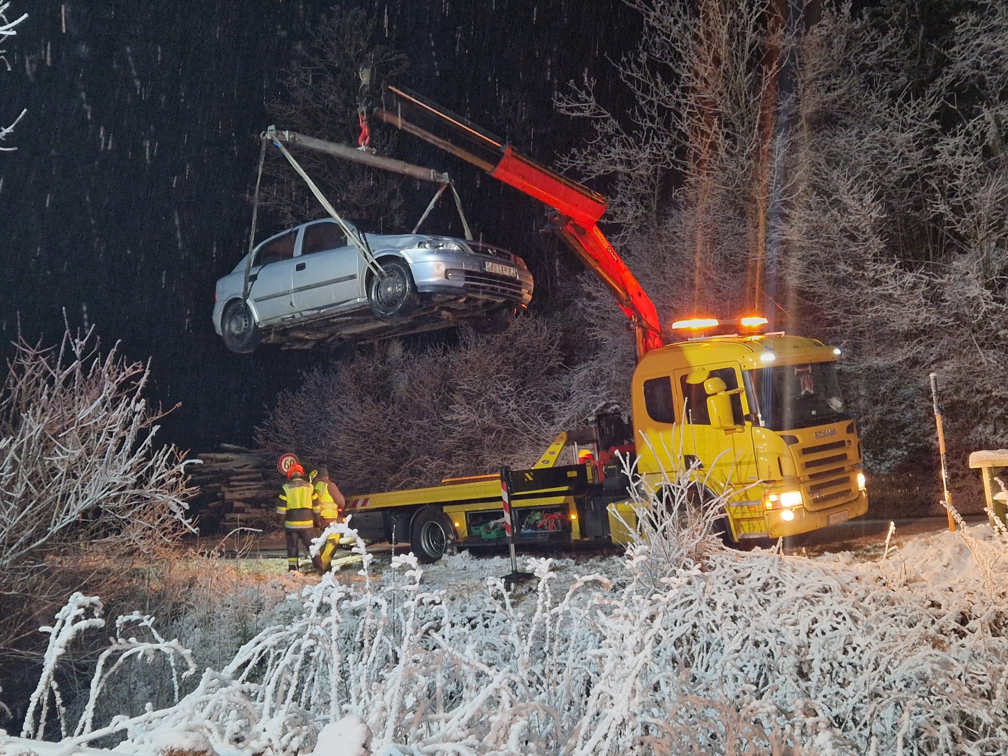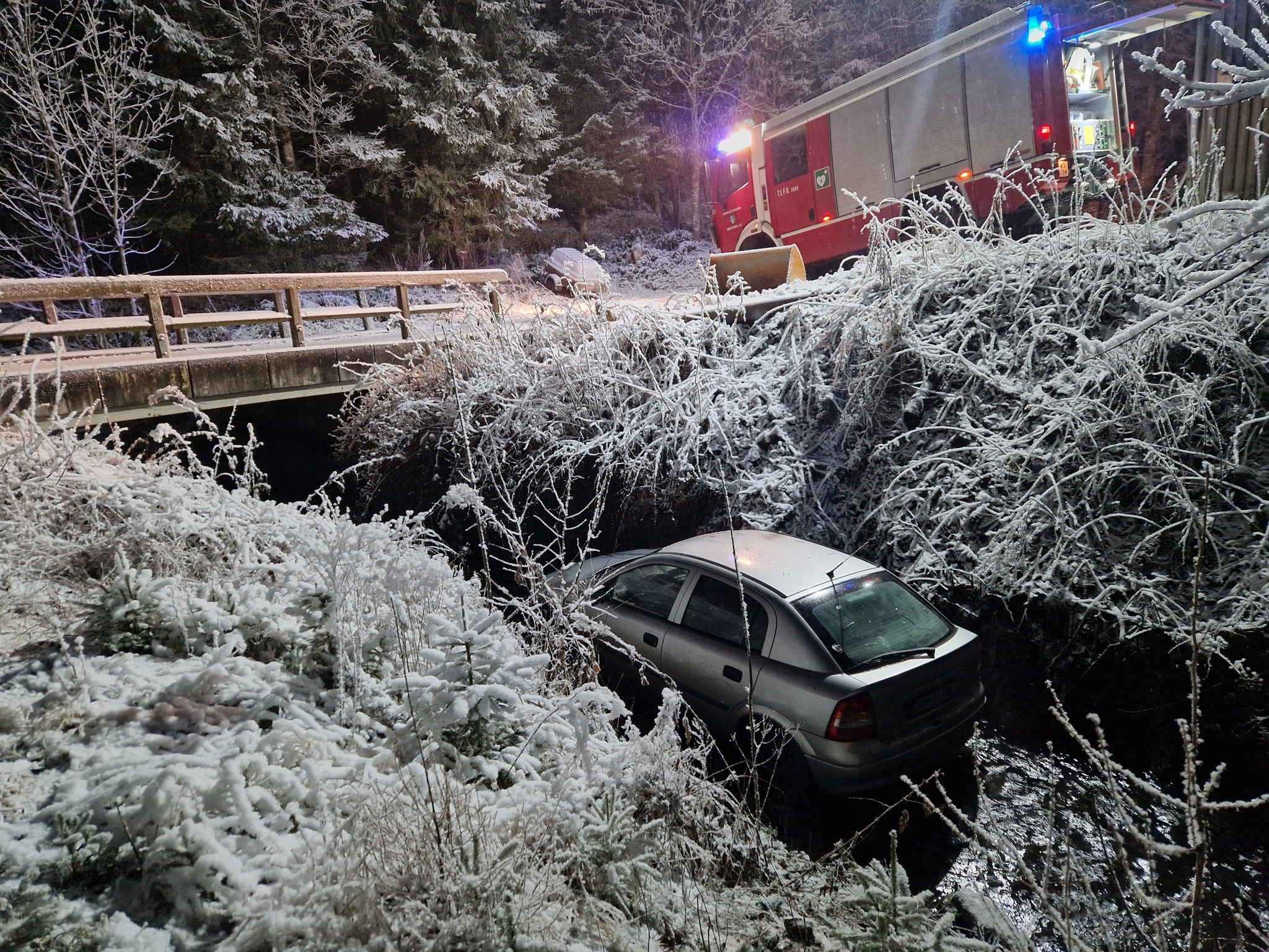 Ein PKW kam bei schneebedeckter Fahrbahn von der Straße ab und landete im Bach. Das Auto wurde mit einem Kran eines Abschleppunternehmens aus dem Bachbett gehoben und abtransportiert.