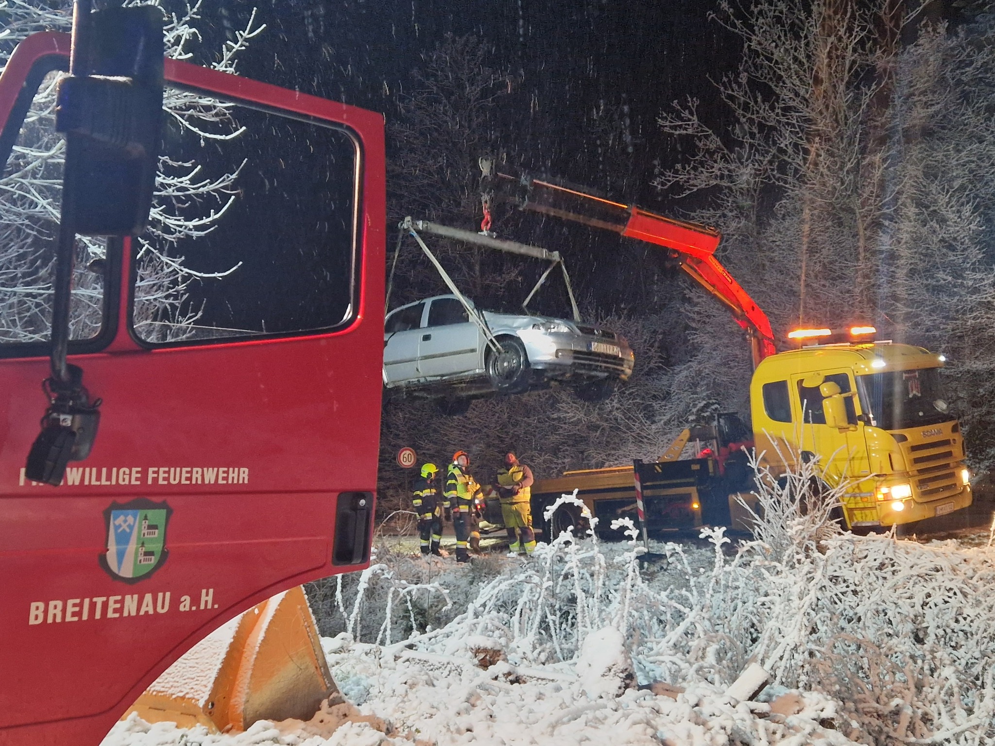 Am 23.12 kam ein PKW bei Schneefahrbahn von der Teichalmstraße ab. Das Auto wurden von der FF Breitenau per Seilwinde geborgen.